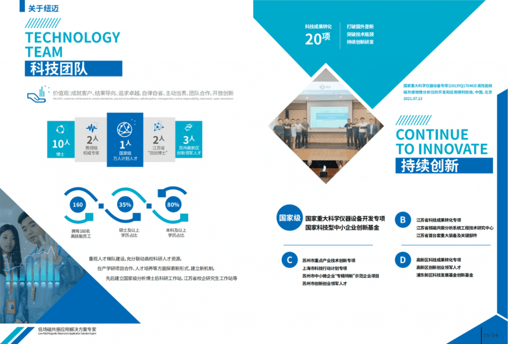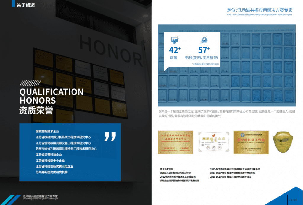 公司成立至今,已通过ISO 9001:2015质量管理体系认证、CE认证,建立了国家博士后工作站、江苏省博士后工作站、研究生工作站和区研究生工作站,同时已被认定为江苏省核磁共振分析系统工程技术研究中心、苏州市低场核磁共振仪器工程技术研究中心、苏州市纳米空隙核磁共振检测工程技术研究中心、苏州市企业技术中心、江苏民营科技企业、江苏省科技型中小企业等。