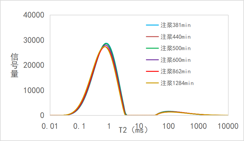 1、根据图三注浆弛豫可知,随着注浆的不断进行,在注浆后期固化阶段,核磁信号不断降低,证明了浆液与岩心持续相互作用,水分不断参与反应,浆液逐渐固化。